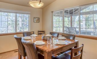 Book your next getaway in this charming cabin near Sunriver, between the Deschutes River and Mount Bachelor! The open living room has lots of windows for filtered woodland light and a large flat-screen TV you can watch from the leather sofa; the wood stove will keep everyone toasty on cool evenings.