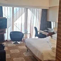 Номер очень просторный, что очень удобно для тех, кто носит с собой много вещей! Общий тон комнаты — теплый, уютный и комфортный. Кровать очень мягкая и удобная, чувствуешь себя как дома. Лучшая конструкция — телевизор, у которого можно регулировать угол и положение. Персонал на стойке регистрации был дружелюбным, проводил нас до номера и угостил бесплатным кофе... Это был хороший опыт пребывания ~ Рекомендую