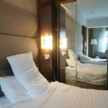 Мы забронировали номер на троих. Комната была довольно большая, с одной большой кроватью и одной маленькой. Комната красивая и выглядит очень удобной. Обстановка и гигиена в отеле в целом выглядят довольно хорошо. В частности, обстановка и обслуживание во время завтрака очень хорошие, и я чувствую себя хорошо во время еды.