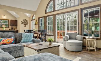 Inside, natural light pours through the soaring windows of the vaulted-ceiling common area, creating a warm, welcoming vibe. Cozy up by the fireplace in the living room for movie nights, or simply enjoy a quiet evening with a glass of wine and the serene lake view.