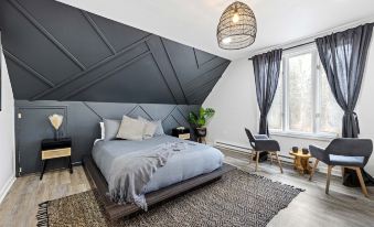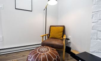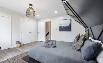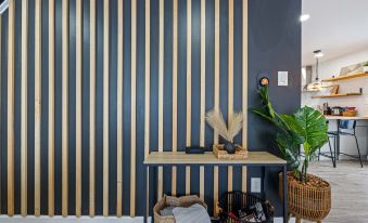Boho-Scandinavian inspired home design with fully equipped kitchen with dishwasher, coffee station, microwave and full-size refrigerator.