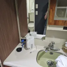 Маленькая уютная комната, Чайник удивительной конструкцией, вскипает без паровыделения, и микроволновка для подогрева пищи в пластиковой упаковке, то же необычная, внутри плита, которая не вращается, ставить на 3 минуты. Душевая и туалет, то же удивляет, прямо, как будто для детей.