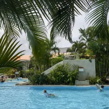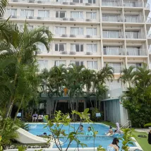 Хороший отель.Бронировали сначала на 2 ночи,чтобы осмотреться после прилета.В итоге решили остаться на всю неделю.Сначала жили в номере с одной кроватью,небольшой номер.Потом переселились в номер с двумя односпальными -и номер больше,и балкон есть.Чисто,убирают каждый день,все расходники присутствуют,чайник,фен,холодильник- полный комплект.Включен завтрак-азиатский)),но выбрать можно.Есть бассейн с небольшой горкой, чистый,мелкий-окунуться в жару можно,для детей хорошо.Каждый день ходили в термы в отеле- два горячих бассейна,бочка с холодной водой,парилка, хорошо.По приезду сначала запаниковали- промзона какая-то.Потом огляделись,нашли кафе и магазины,недалеко торговый центр большой,там и поесть-попить и погулять можно.С заднего хода остановка автобусов.Доезжали до аэропорта,а оттуда и в парк,и в город,и в американскую деревню ездили.Пляж через мостик от этого молла,приличный,душ(платный),туалет,умывальник,рядом батуты,горки .У отеля есть трансфер от-до аэропорта,но мы не воспользовались,т.к по времени не совпали-прилетели поздно,улетели рано.Вывод- отель хороший,но выйти особо некуда.