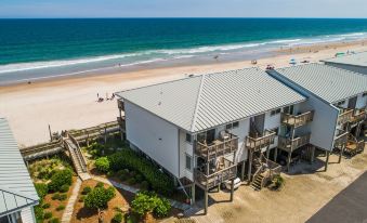 The living area at the rear of the condo features comfortable seating, a flat-screen TV, and sliding doors opening to the oceanfront deck. Additionally, the living room includes a queen sleeper sofa for extra guests. The two bedrooms are located to the right of the living area. The master bedroom, positioned on the ocean side, boasts a king bed, sliding doors leading to the oceanfront deck, and a private en suite full bathroom. At the opposite end of the hallway, the second bedroom offers two twin bunk beds and private access to the soundside deck. An additional full bathroom is conveniently situated in the hallway between the two bedrooms.
