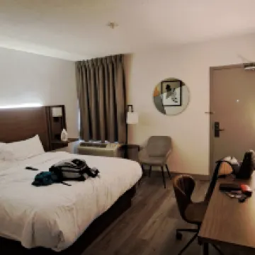 Hotel propre ..pas déjeuner mais Tim horton juste à côté.. centre de toronto (cn tower) qui est environ 1h30 en autobus, tramway ou métro ..