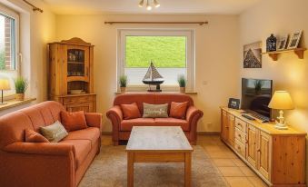 The apartment "Strandkorb" on the ground floor is 52 square meters and has a spacious and cozy living-dining room and a fully equipped kitchenette. The kitchen equipment includes a stove, oven, extractor hood, refrigerator, freezer, dishwasher, microwave, coffee maker, coffee pad machine, soda streamer, kettle, waffle maker, toaster, sandwich toaster, electric can opener, blender and all the necessary utensils from A like aluminum foil to Z like citrus press.