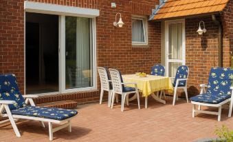 The holiday home with its three comfortably and lovingly furnished holiday apartments is ideally located directly on the dike in the North Sea resort of Tossens. The house has an approximately 1000 square meter well-kept garden, which even has a small playground for the little guests. The Frisian beach is in the immediate vicinity and the center of Tossens with restaurants and shops as well as the Center Parcs North Sea coast can be reached on foot in a few minutes.