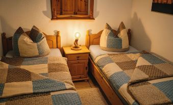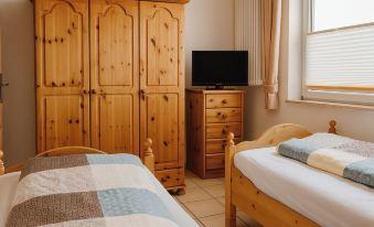 The bedroom is furnished with two beds, bedside table with lamp, wardrobe and chest of drawers. If you are traveling with a baby / toddler, a travel cot is also available, which can also be placed in the parents' bedroom.