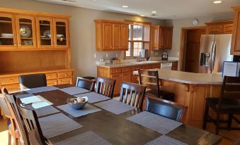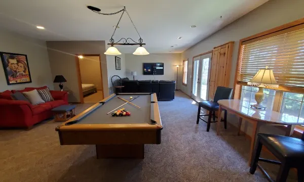 On the Lower Level (walk-out basement) you will find the large Family Room with full size pool table, media area, very nice kitchenette/wet bar, 2 bedrooms and 1 Full Bath. (2 King Beds, 1 Queen, 3 sets of Bunk Beds, and 2 Queen Air Mattresses).