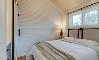 Overlooking a serene lake, this gorgeous retreat is nestled in the quiet woods of a tiny home-gated community.