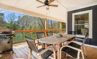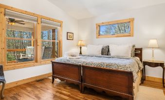 Great for hosting friendly get-togethers and family reunions, Serenade Collection tops the list of group rentals in the North Carolina mountains, reserving an entire private property for your event. The two homes in the collection neighbor each other, with Serenade Shores overlooking a private fishing pond and Serenade Cove situated higher up with a scenic mountain view. Located halfway between Hendersonville and Brevard, NC, Serenade Collection allows for limitless activities that center around the water - a warm weather picnic, a stroll to the fire pit by the waterfall, a late night bonfire in the clearing. Get in touch with nature with wildlife right in your yard, including bullfrogs and songbirds that will keep you company as you walk along the wooded path. Discover the shady bench that is ideal for fishing with a friend. Catch the vibrant foliage in the fall, and in the winter you can see the French Broad River in the distance.