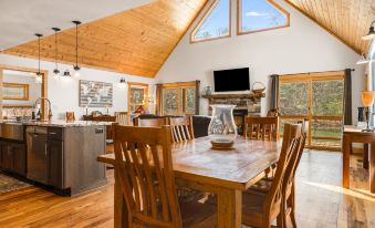 The upper cabin, Serenade Cove (5 Minute Walk/2 Minute Drive To Serenade Shores), features a vaulted ceiling and two-story windows that fill the living area with light. The spacious wrap-around deck with a gas grill and an outdoor dining space is just right for watching the sunset. In the evening, Serenade Cove invites you to kick back and relax in the leather reclining chairs by the gas fireplace before settling into one of the main level bedrooms, or the loft area with twin beds and a half bath. Together, the two homes can accommodate small groups of up to 10 guests. Bonus: having two washers and dryers to share the laundry. The Serenade Collection provides a perfect retreat for making memories in the North Carolina mountains!