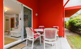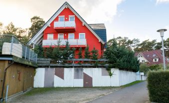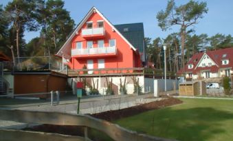 Apartment house, 2 storeys. In the resort 1.5 km from the centre of Trassenheide, on a slope, 300 m from the sea, 300 m from the beach. In the house: storage room for bicycles, central heating system. Parking on the premises. Supermarket 1.5 km, restaurant 210 m, bakery 1.5 km, café 1.5 km, bus stop 1.6 km, railway station 1 km, thermal baths "Bernsteintherme" 2.7 km. Golf course (18 hole) 29 km, surf school 2.7 km, tennis 2.5 km, minigolf 2.6 km. "Meerzeit", 3-room apartment 50 m2, on the ground floor. Cosy furnishings: living/dining room with cable TV (flat screen), radio. Exit to the terrace. 1 room with 1 double bed. 1 room with 1 x 2 bunk beds. Kitchenette (4 hot plates, dishwasher, toaster, kettle, microwave, electric coffee machine). Shower/WC. Terrace. Terrace furniture. Facilities: children's high chair, baby cot. Parking (1 car) at the house. Please note: non-smokers only. Smoke alarm.