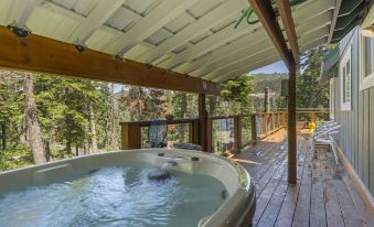 The wrap-around patio, accessible from the main living spaces is where you’ll find a comfortable lounge area, an outdoor dining table, and reclining chairs ideal for sunbathing. Plus, this incredible patio offers guests private access to the covered hot tub! Available year-round, this hot tub is the perfect place to enjoy the breathtaking views and soothe sore muscles after a day on the slopes or trails.