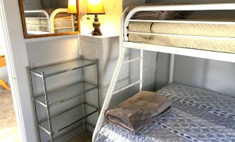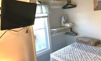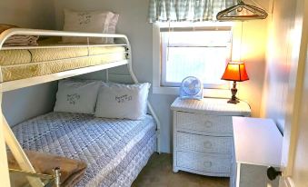 It has a full kitchen, refrigerator with freezer, gas stove with an oven, cooking utensils, microwave, waffle maker, coffee maker, ice blender, toaster, popcorn popper, TWO flat screen TVs (one in kitchen/living room and one in a bedroom), cable, internet, FREE wifi, gas heater, ceiling fan, window fans, no AC, small grass lawn, picnic table w/umbrella, lawn chairs, charcoal grill, and a safe off the street parking lot. Parking is limited to TWO vehicles. No boat trailers or campers.