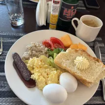 Удобства были устаревшими, а фен работал с трудом. Однако обогреватель в ванной был вполне приличный и работал даже в августе, компенсируя значительные перепады дневных и ночных температур, характерные для местного климата. Завтрак был хорошим, но выбор был ограниченным. К сожалению, крытый бассейн был слишком горячим, что сделало отдых немного скучным.
