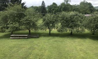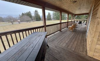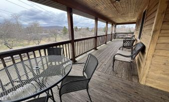 Large house with a porch that wraps completely around the house! A beautiful view from all sides. We love the outdoors and we bet you do too. The yard has several Apple trees which our kids love to climb and they also love to watch the deer come and eat in the evenings. There is also an outdoor firepit for smores during evening gatherings. The inside is great for large groups as well. The kitchen, living and dining areas are all open concept and there is a dining room table which can seat 10. The house has 4 bedrooms, 3 1/2 bathrooms and a loft.
