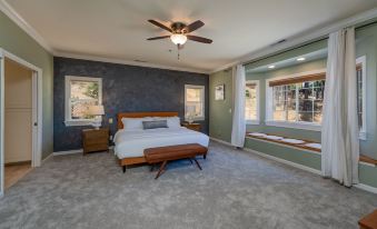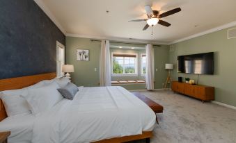 Flat-screen Smart TV w/ cable, wood-burning stove, modern finishes, high ceilings, natural light, ceiling fans, walk-in closet and Jacuzzi in master bedroom