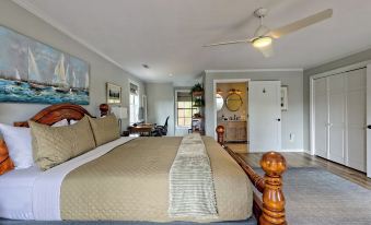 The outdoor areas are designed for relaxation and fun. Swim off the dock or lounge on the upper deck, complete with seating and an umbrella. For water adventures, 6 kayaks and 1 paddle-board are available to rent for $100 per stay. Additionally, a golf cart can be rented for $100 per stay to shuttle your gear down to the lake. Golf carts are not allowed off the property.