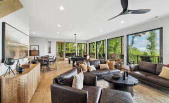 Escape to luxury at this brand-new mountain modern retreat in Morganton, GA! Perched on 1.39 acres with jaw-dropping panoramic views, this 4BR/4.5BA that comfortably sleeps 8 has stunner features floor-to-ceiling windows, a chef’s kitchen, 3 fireplaces, hot tub and a spacious game room. Relax on the deck, sip wine by the fire, or explore nearby Blue Ridge and Lake Nottely. We now have a firepit! Professionally furnished and ready for unforgettable stays, perfect for families or groups seeking style, comfort, and mountain seren