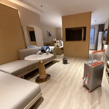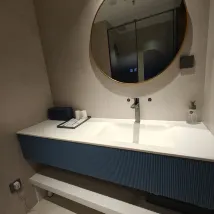 Номер был чистым и опрятным, оформленным в современном стиле лёгкой роскоши. Синий оттенок Anya Blue в сочетании с гибкой люстрой, огибающей пространство, создавал роскошную, уютную атмосферу, идеально подходящую для фотосессий. Умная система управления в номере была просто фантастической: можно было управлять освещением, телевизором, кондиционером и даже умным туалетом с помощью голоса, создавая поистине высокотехнологичный опыт. Постельное бельё было удобным, а матрас с нулевым давлением обеспечивал прекрасный ночной сон. Отель также предлагает чайные сервизы ручной работы и чай Phoenix Dancong. Нежная лапша с фирменным соусом из жареного перца стала поистине восхитительным дополнением. Тренажерный зал и прачечная полностью оборудованы, а при отъезде вас ждал сувенир — поистине замечательный подарок!