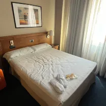 El edificio está ubicado entre el centro y las estaciones del tren y de autobuses. El edificio tiene seis plantas con muchas habitaciones. El personal de recepción es amable y eficaz. Tiene al menos dos ascensores, pero para ir a la tercera se deben usar los dos que, por cierto, no están juntos. Un absurdo poco práctico. Los pasillos tienen iluminación poco uniforme y la identificación de las habitaciones estaba bien. La habitación para uso individual tenía unos 14 m2 o sea era pequeña y tenía una distribución poco práctica. De hecho, la puerta de entrada casi daba en la cama. La cama de 1.50m era cómoda y las almohadas eran correctas. La insonorización no era muy buena, se oía el ruido del exterior y del pasillo. Ade3, había un chirrido intermitente de algún sistema ventilación o refrigeración del otro lado del baño. La iluminación era correcta y se podía dejar completamente a oscuras. El mobiliario estaba en buen estado. Menos el minibas que tenía descolgada la puerta La TV era de unas 40", y se veía muy bien. Había muchos canales locales y nacionales de la TDT española. El aire acondicionado se podía regular de manera algo pedestre. El baño no era amplio y cómoda de usar. La iluminación del baño era correcta. La grifería de la bañera era incómodo además se regulaba malamente la temperatura del agua. Las toallas estaban bien. El desayuno no era muy correcto para esta categoría, además de la falta de mesas y personal para recogerlas y reponer comida. La Wifi funcionaba bien . En resumen, una opción regular en el centro de la ciudad, con algunos problemas.