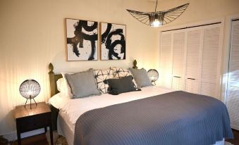 Featuring three newly remodeled bedrooms, the cabin can sleep 6 (8 if there are children). The primary bedroom has a king bed, floor-to-ceiling windows and a desk. It also features a modern en-suite bathroom with a walk-in glass shower.