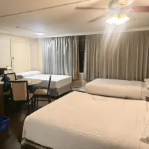Комната была неразделённой, с тремя большими кроватями. Обеденная зона и кухня находились с одной стороны, а ванная комната тоже была довольно маленькой.