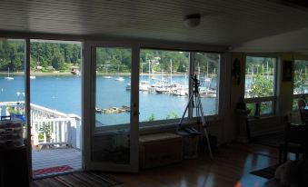 In Winter, the view becomes dramatic. A roaring fireplace keeps everyone toasty while watching the storms roll in over the harbor. The best time of year for the hot tub:-)