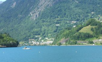 beautiful apartment in a 4-person villa of 40m2 with very beautiful heated veranda overlooking the lake and the mountains. 1 bedroom with 1 double bed, 1 sofa bed for 2 people with memory foam mattress in living room. American kitchen with dishwasher, oven, 4 gas hob fridge freezer
