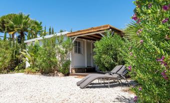 The holiday chalet is located in the botanical garden area of our finca, just below the pool terrace with its own parking space. It is around 35m² in size and offers plenty of space to relax for 2 adults. (The finca is unfortunately not suitable for children). Via the approximately 21m ² covered terrace you reach the living room with kitchen, seating and entertainment media via 2 steps through the front door. In the back area you will find the bedroom with double bed and entertainment media on the right. On the left you will find a bathroom with shower and toilet. On the far right is the spacious dressing room with a wardrobe.