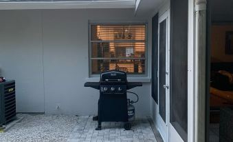 Private tropical Screened lanai, paver patio with umbrella and chairs, gas grill, umbrella table and chairs! Hanging lights for nighttime fun too!