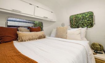 Inside the Airstream, every detail has been thoughtfully designed. Relax on the plush queen bed, prepare meals in the fully equipped kitchen, and unwind in the sleek designer bathroom, which features a luxurious walk-in shower. With air conditioning for comfort and ample storage to keep your belongings organized, this space combines elegance with practicality.