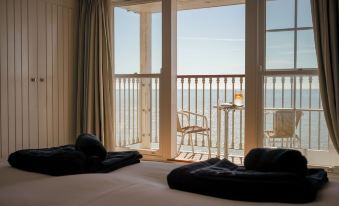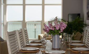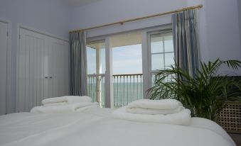 Enter the building via the rear access from the private car park, leads you directly into the main interior living area. It features a large balcony and open-plan living, dining and a modern kitchen. It is the perfect place to prepare your delicious breakfast in the well-equipped kitchen and enjoy the panoramic sea views. The living spaces and bedrooms throughout have been beautifully decorated, with leather sofas, stylish artwork bringing a relaxed “beach house” feel throughout the spaces. When it is time for bed, enjoy the lullaby of the ocean and wake up to the sea from the master bedroom with its own balcony. For the children, there is a decorated Pirate themed room waiting for them after a long adventurous day.
