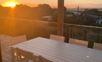 This is a brand new property perched on top of the hill with amazing views out across farm land and Anderson's Inlet. The top story deck is the perfect place to sit and soak in the view while enjoying the sunset and the peaceful surroundings. The inside floor plan and furnishings have been specifically designed to easily accommodate larger groups- and is perfect for 2 large families. There is a well-stocked kitchen with a large oven, a gas BBQ outside and a second fridge downstairs in the laundry. The spacious lounge with large smart TV is the perfect place to sit and relax, while the fire burns in colder months and also a separate living space downstairs for the kids to play and watch TV. There are 2 large bathrooms, 3 toilets and even an outdoor heated shower. Set on a large fully-fenced block with a sheltered kennel under the carport, there is plenty of space outside if you want to bring your dog along too. All linen is supplied, as well as children's books, toys, high chair and portacot- so you don't need to pack much at all.