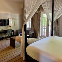 Это оазис: пыль, назойливые продавцы, шум – все прекращается у входа. Обстановка тропическая, иногда встречаются олени, мангусты и обезьяны. Туман водопада хорошо виден, когда вы сидите на террасе Стэнли, чтобы поесть и выпить. Наши номера были обновлены, кровати были правильной фирмы. Все удобства, которые вы ожидаете, были там. Завтрак хороший, в Junglr Junction (и был включен в стоимость нашей вечеринки). Персонал очень услужливый, рад сделать все возможное. Странно отметить, что украшения, имена, атмосфера — все прославляет королеву, белую историю и прославляет колониальные времена. Я не ожидаю здесь истинного описания истории, но немного больше прославления богатой культуры и племен Зимбабве помогло бы сбалансировать ситуацию.