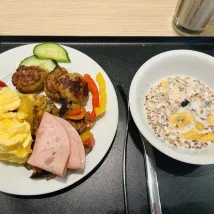 Завтрак хороший и свежий, с режимом самообслуживания, когда вы сами убираете со столов и возвращаете использованную посуду.