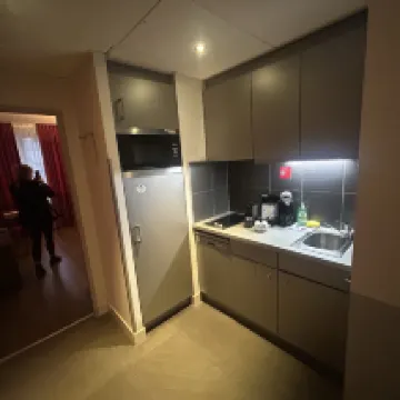 Мини-кухня в номере оборудована раковиной, микроволновой печью, холодильником, посудомоечной машиной и кофемашиной, что очень хорошо.