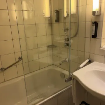 На аллее перед отелем есть рестораны и бары, и атмосфера там приятная. В холодильнике был мини-бар, которым можно было пользоваться бесплатно. Отель длинный, поэтому некоторые номера находятся далеко от лифта. Интерьер номера был симпатичным и создавал приятную европейскую атмосферу. Я не пользовался телевизором, но он не включался как следует. Я смог расслабиться, наполнив ванну горячей водой, но иногда горячая вода в душе текла не так, как надо. Но после того, как я несколько раз выключил и отрегулировал напор воды, всё заработало, так что это не было большой проблемой.