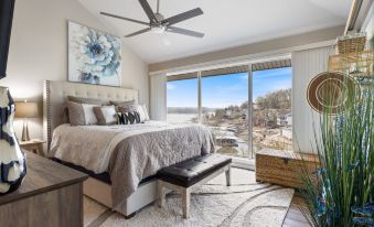 The master suite features a large king-sized upholstered bed, dresser, nightstands, floor to ceiling windows overlooking the lake, and a sliding glass door to the balcony. The master bathroom features a tile shower and single vanity sink.