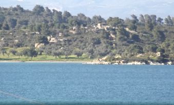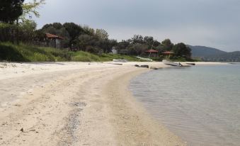 The distance from the sandy beach is almost 50m. It is a peaceful beach, with tranquil warm waters, due to the little island "diaporos" which "protects" the gulf from bad weather.