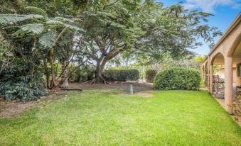 Lush Landscaping: Beautifully mature landscaping with Royal Poinciana trees, white fig succulents, and Areca palms.