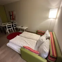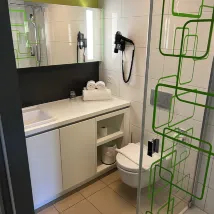 Комната большая, уровень гигиены средний. Не забудьте взять с собой одноразовые тапочки и туалетные принадлежности. Еще есть переходник🔌, под стойкой есть еда, отношение к обслуживанию неплохое.