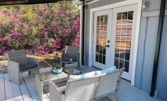 French glass doors lead from the bedroom onto a spacious and lit back porch where you can enjoy the sounds of nature or have a nice conversation with loved ones. There’s plenty of seating with the outdoor furniture and adirondack chairs around the fire pit. Fire up the grill and have a delicious BBQ meal while enjoying the serene outdoor environment and watching wildlife. The fire pit is the perfect place to gather in the evening. Make some s’mores and tell stories, or just admire the beautiful starry night sky.