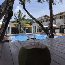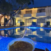 Бассейн у входа просто фотогеничный! Пошёл дождь, и шезлонги промокли, поэтому сотрудники стойки регистрации предложили их высушить. Хозяин даже угостил меня куриной голенью!