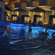 Номер просторный, с бассейном прямо у входа, что делает покупки удобными. Дети сказали, что хотели бы остаться подольше, а место для сёрфинга, которое нашёл отель, тоже было очень хорошим, и им хотелось продолжить играть.