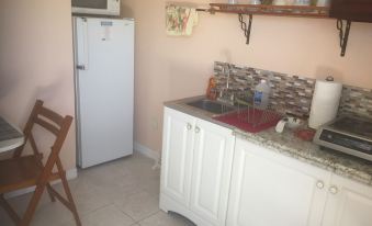 Dinning/ leaving room, table and chairs, with equipped kitchenette comes with all needed appliances ( cooking is limited), one burner for cooking, refrigerator, sink, toaster, microwave, coffee maker, tea pot, multi cooker and other pots, dishes and towels.