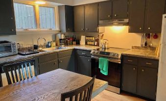 The kitchen is open to the living room and dining area, and contains all the cooking/serving necessities you will need. The living room has a gas fireplace and an HDTV with streaming capabilities.