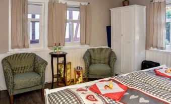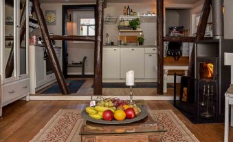 Surrounded by forest and mountains, the holiday home 'the three hazelnuts' is located in the heart of the pretty village of Nazza. The area is a paradise for hikers and cyclists. The half-timbered house is in a quiet street and hiking trails can be reached on foot. Lovingly furnished, the holiday home offers sleeping space for up to six people and has a fireplace and barbecue facilities for the summer. There are shops in the neighboring town of Mihla and restaurants are easily accessible by car. About pets:Pets allowed.About checkOut:Check out before 10:00 AM.About children:Adults only.About checkIn:Check in after 3:00 PM.About smoking:Smoking is not permitted.About events:No events allowed.