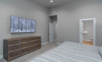 Bedroom 4: Queen bed, 55" Smart TV, and shared Jack and Jill bathroom with views of Jordanelle Reservoir